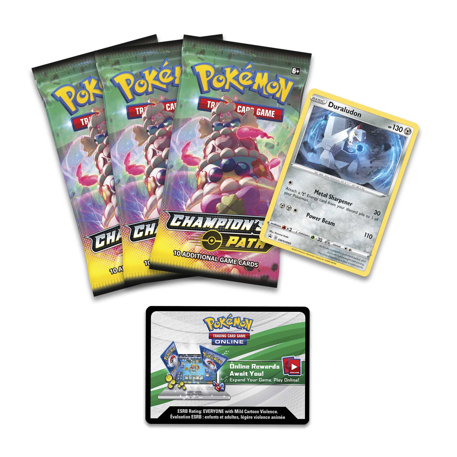 • 3 Pokémon TCG: Champion's Path booster packs, each containing 10 cards and 1 basic Energy